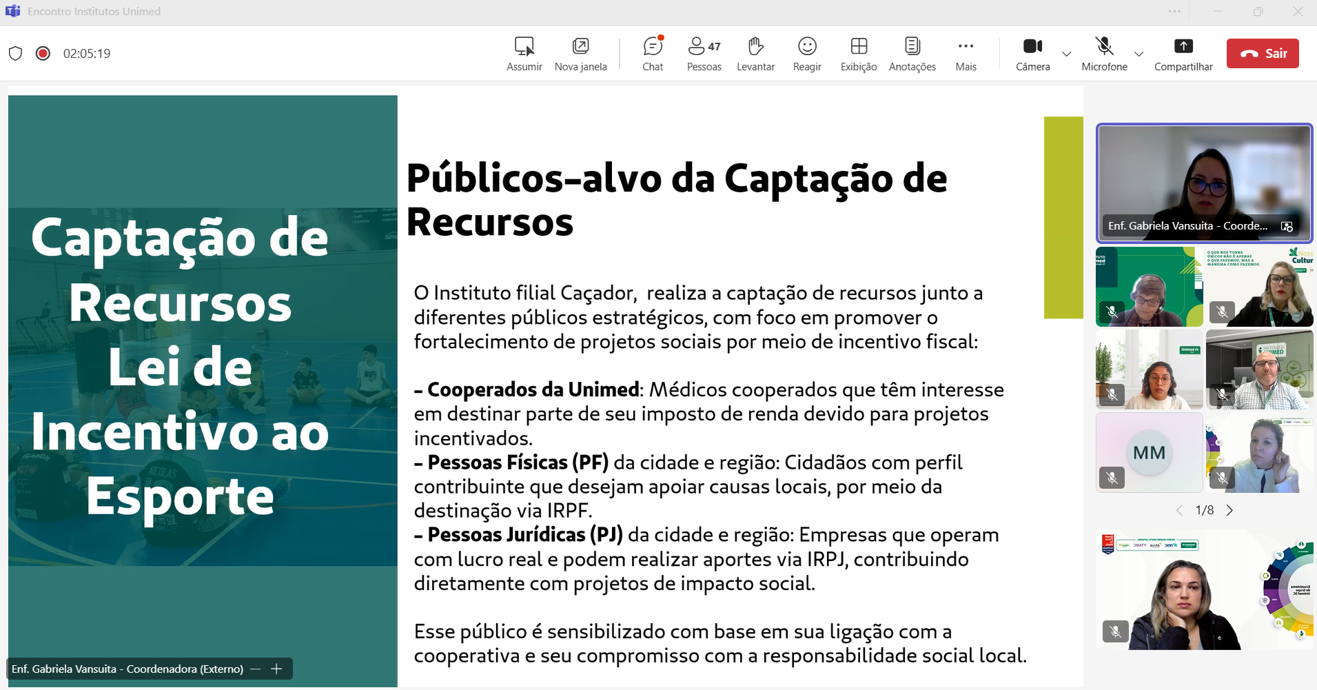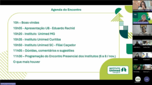 Instituto Unimed Minas Gerais, que apresentou sua experiência com o Redirecionamento Fiscal para projetos sociais. já o Instituto Unimed Curitiba compartilhou suas práticas de mobilização e captação de recursos, enquanto a filial de Caçador, que integra o Instituto Unimed SC, trouxe um cenário sobre como realiza a captação de recursos locais para apoiar seus projetos realizados através de lei de incentivo fiscal.
